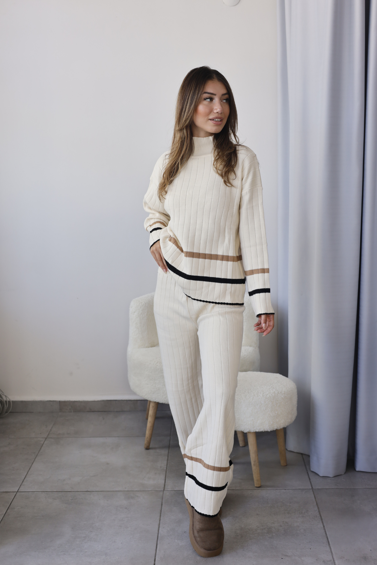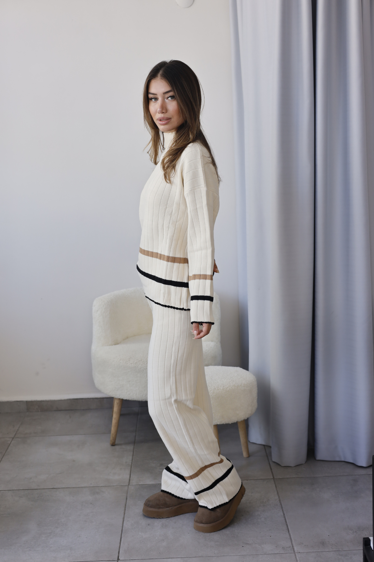 Yüksek bel, geniş paça pantolon kombini ile elegan bir silüet oluşturur.