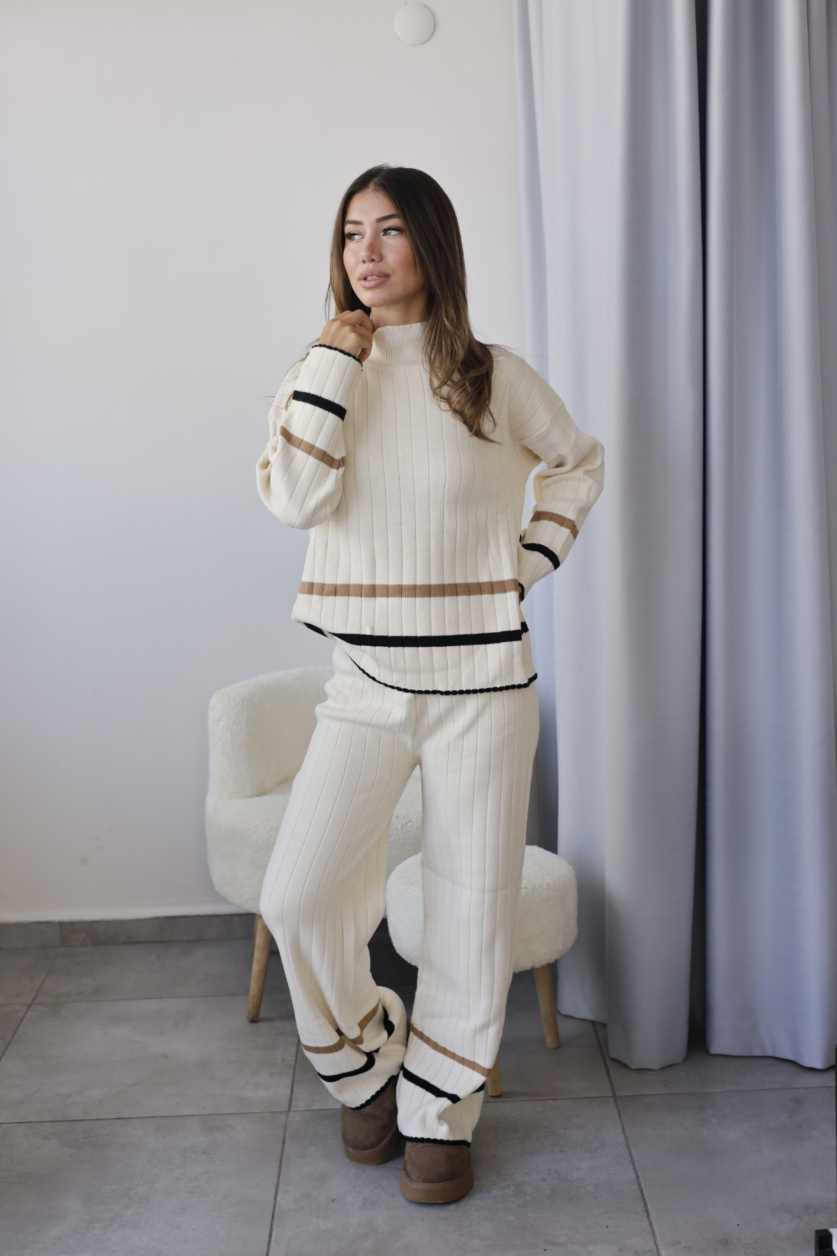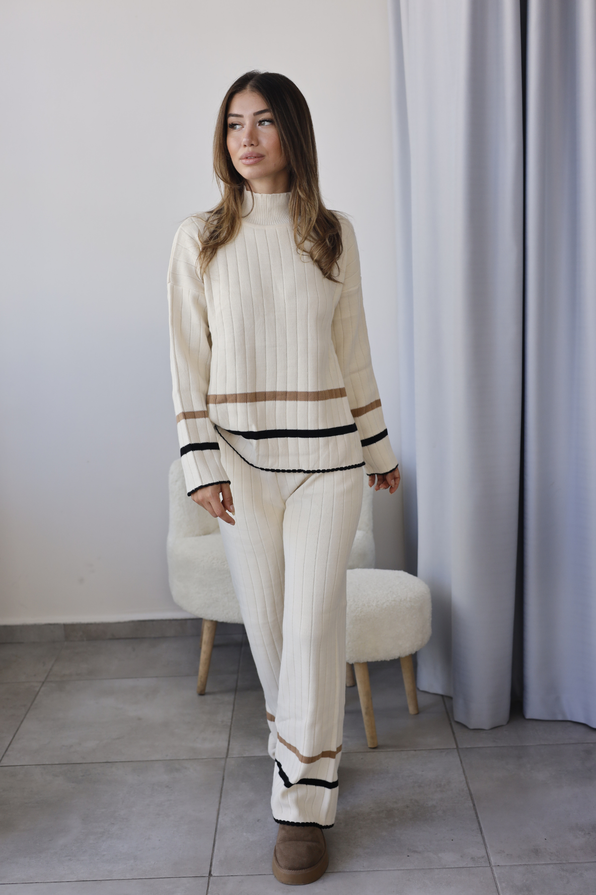 Ekru zemin üzerine siyah ve kahverengi çizgi detaylarıyla modern bir görünüm sunar.