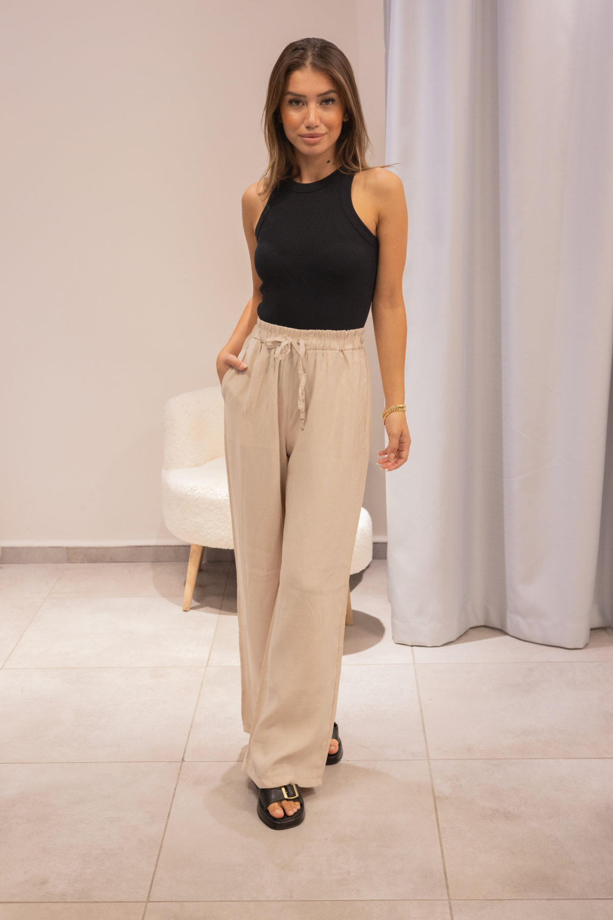 Geniş paça kesimi modern ve rahat bir siluet sunar.