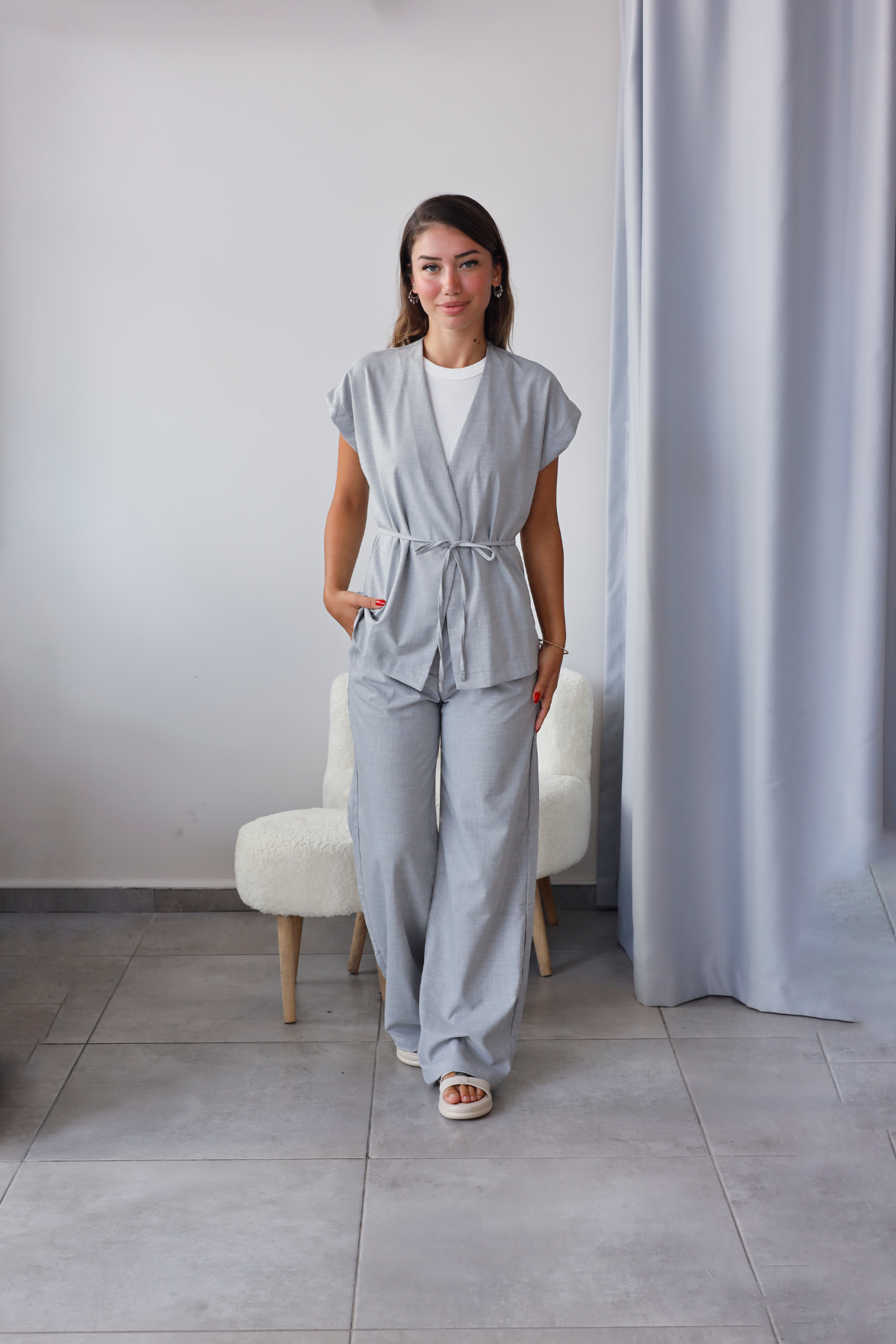 Pantolon düz bel (lastiksiz) ve tam kalıp formundadır.