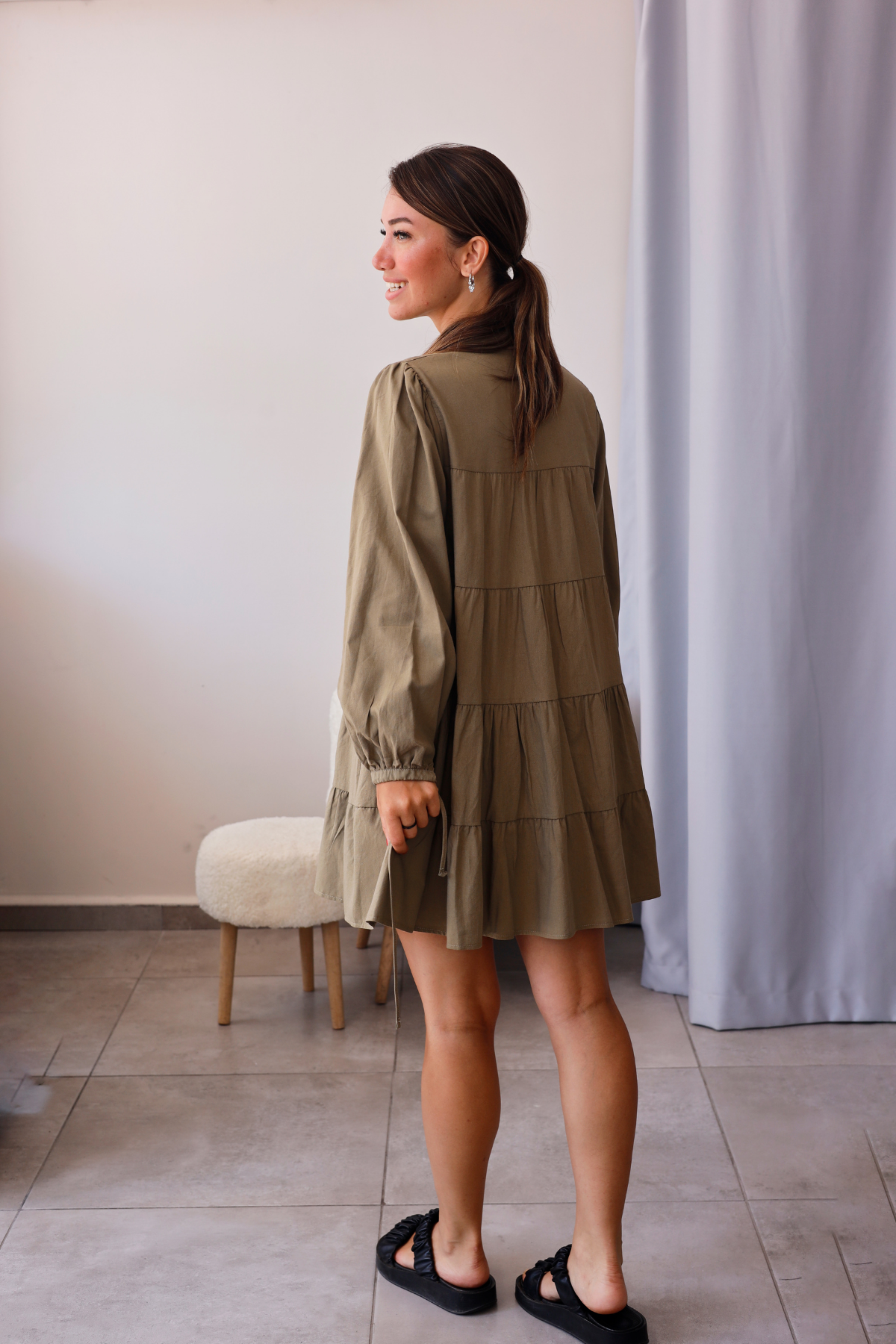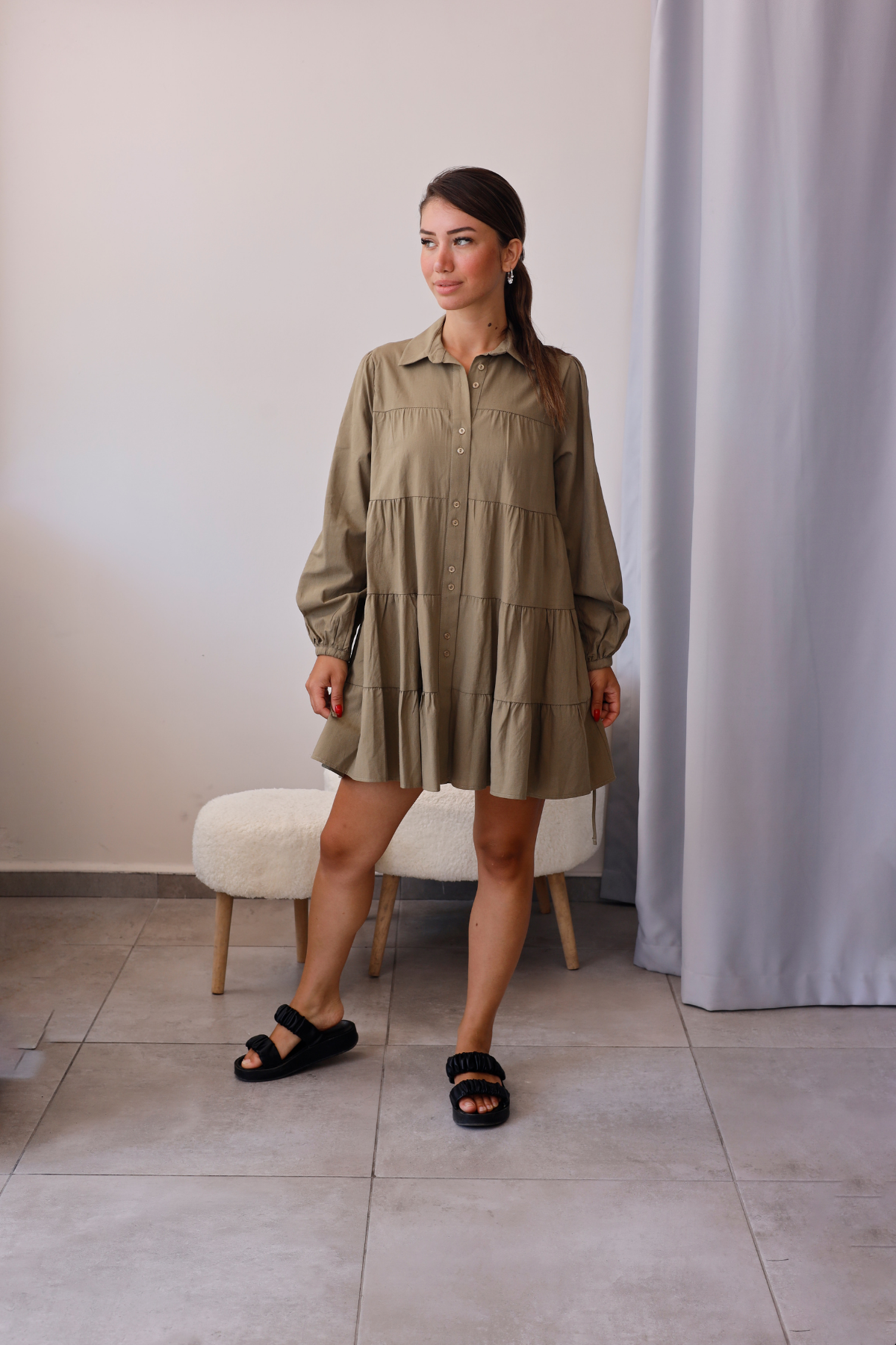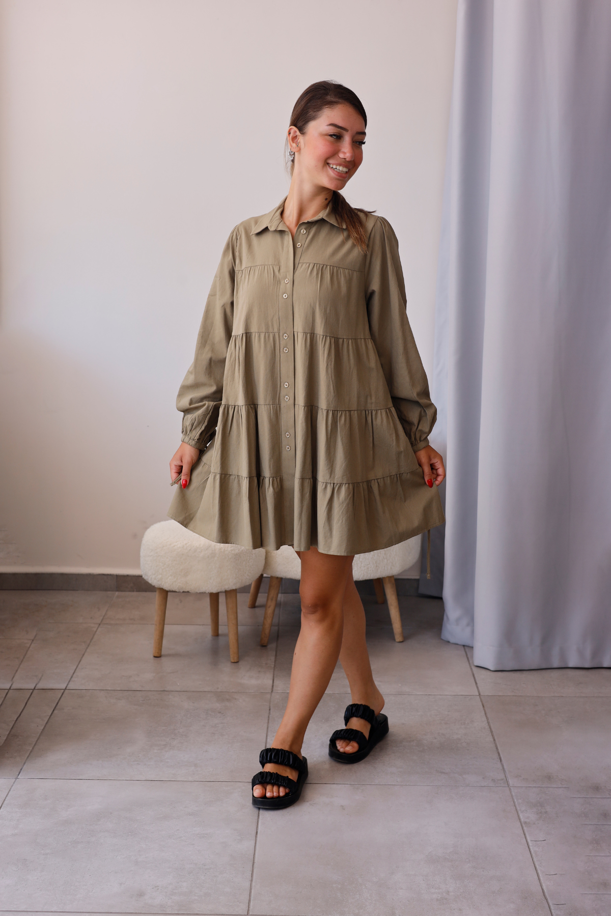Kat kat inen etek formu elbise havası verirken, rahat tunik yapısını korur.