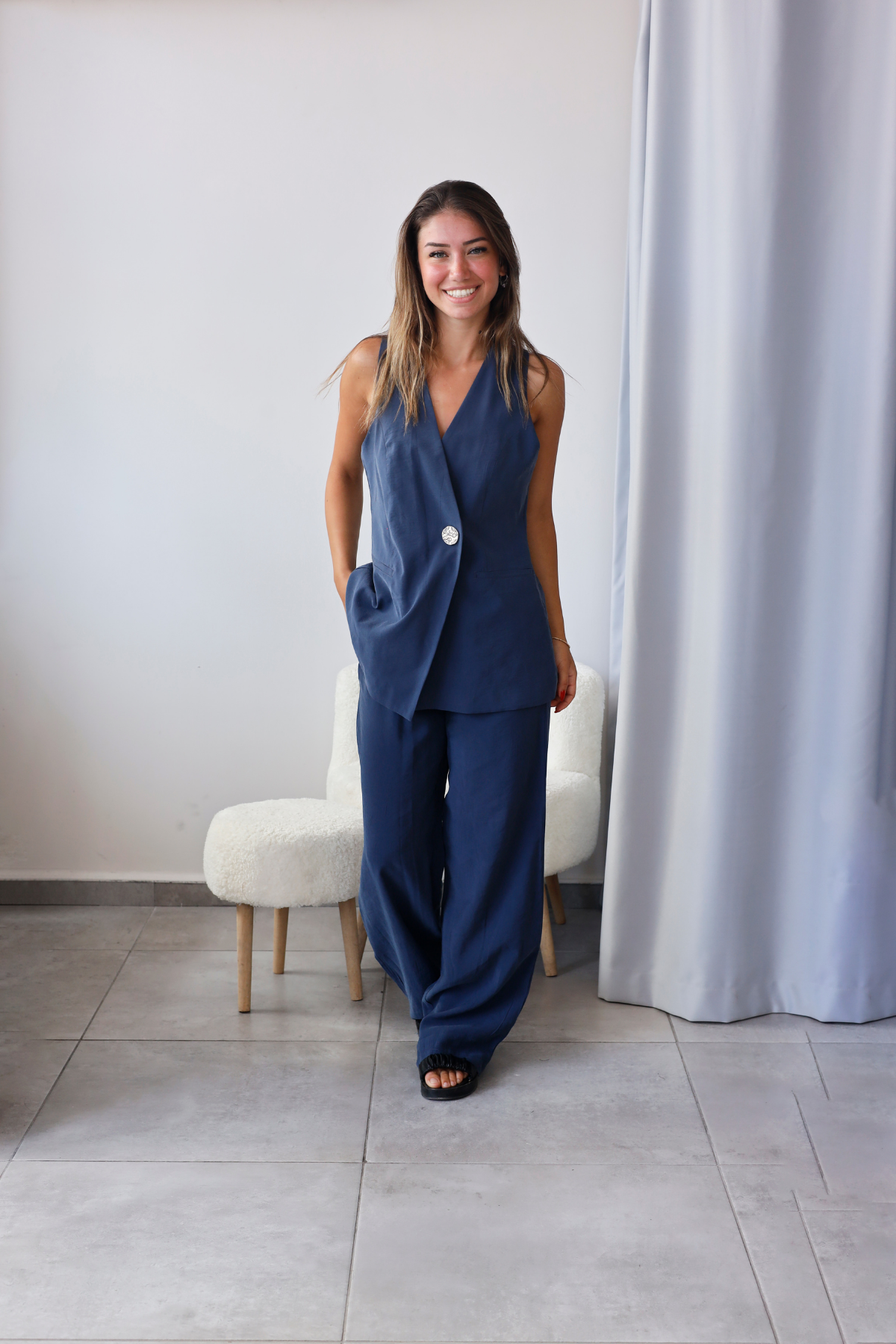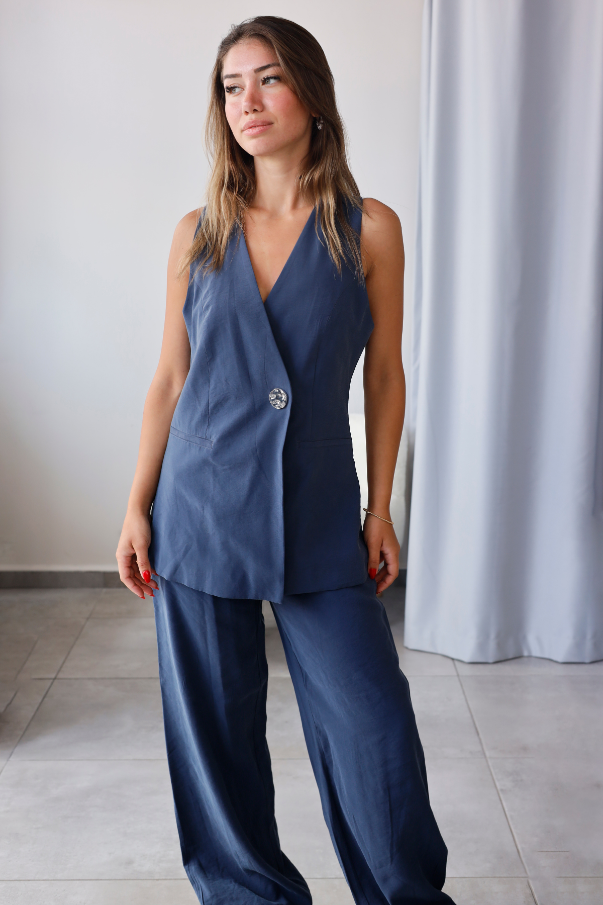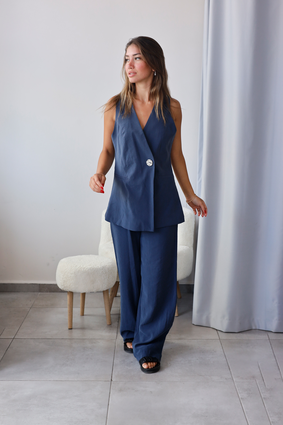 Kruvaze yelek detayı ve zarif düğme kapamasıyla sofistike bir duruş kazandırır.