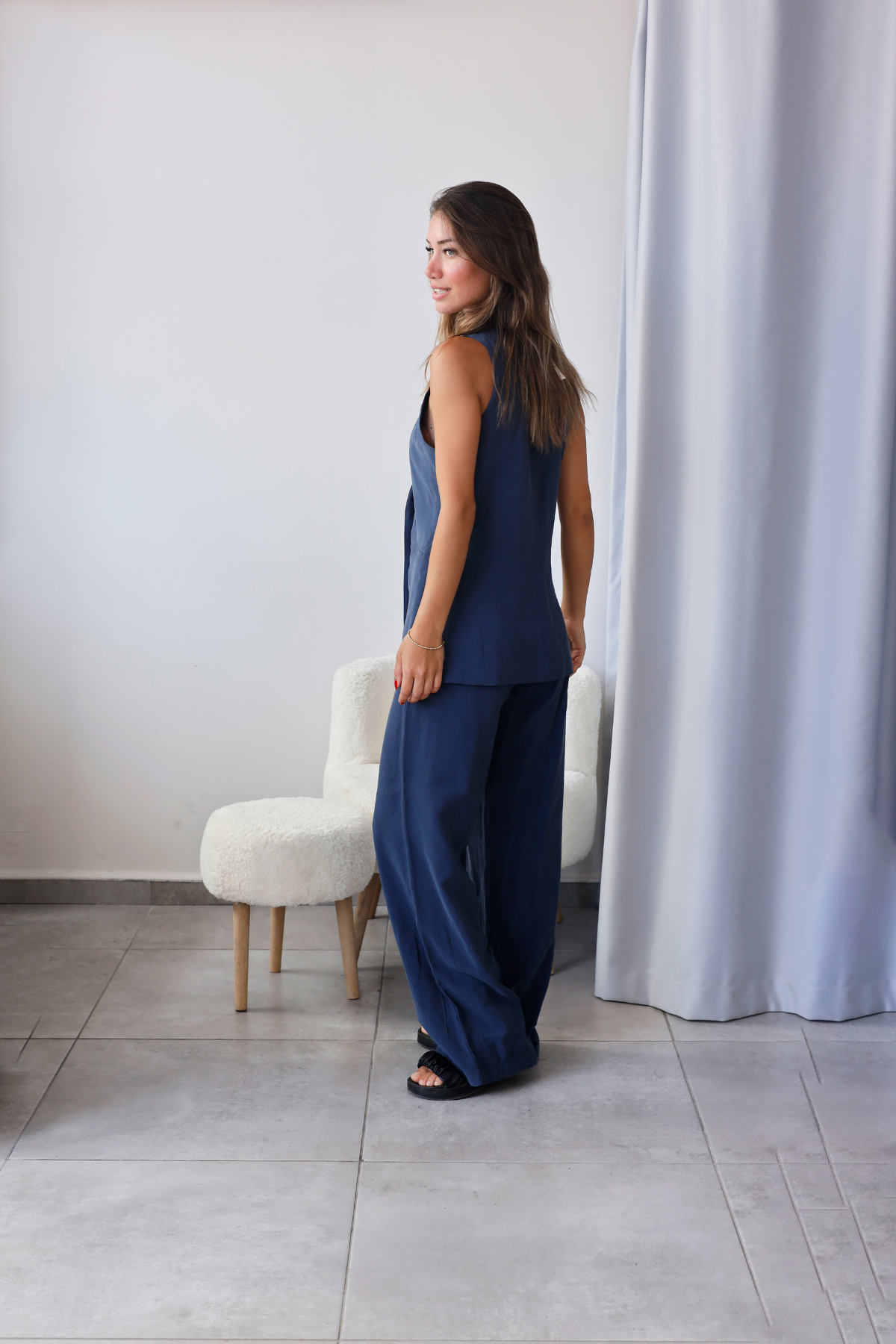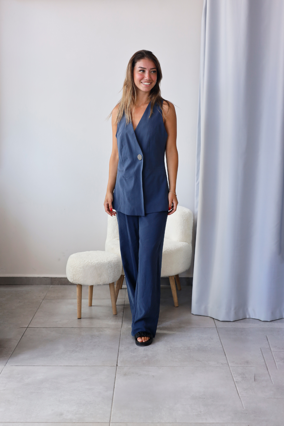 Şıklıkla rahatlığı bir arada sunan modern yelek-pantolon takımdır.