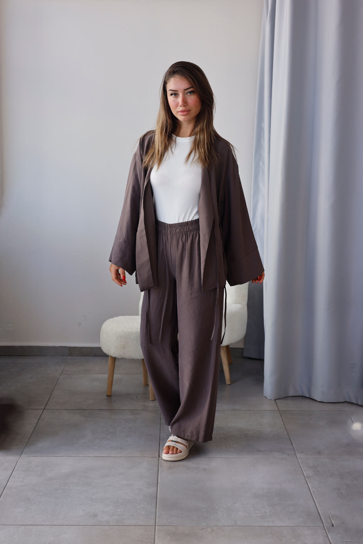 Üst parça kimono kesimli, yandan bağlamalı şık tasarıma sahiptir.