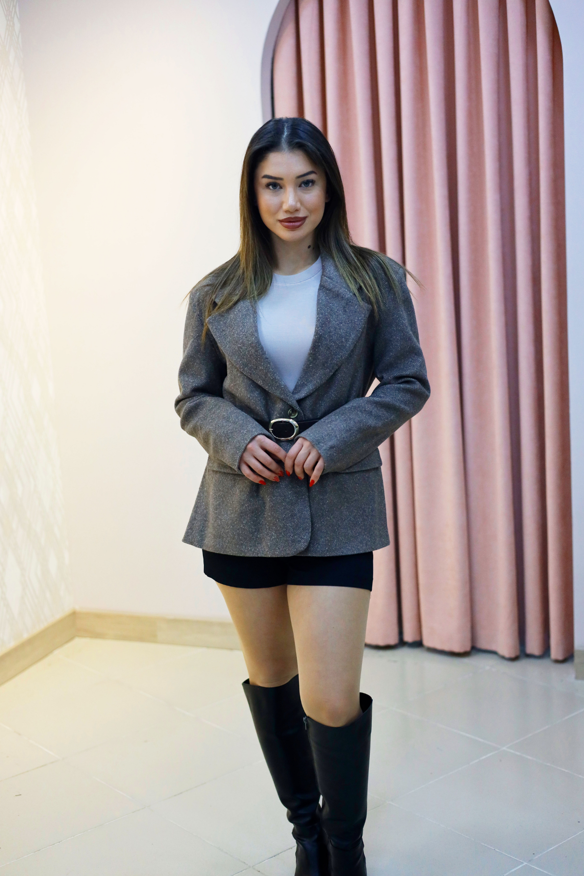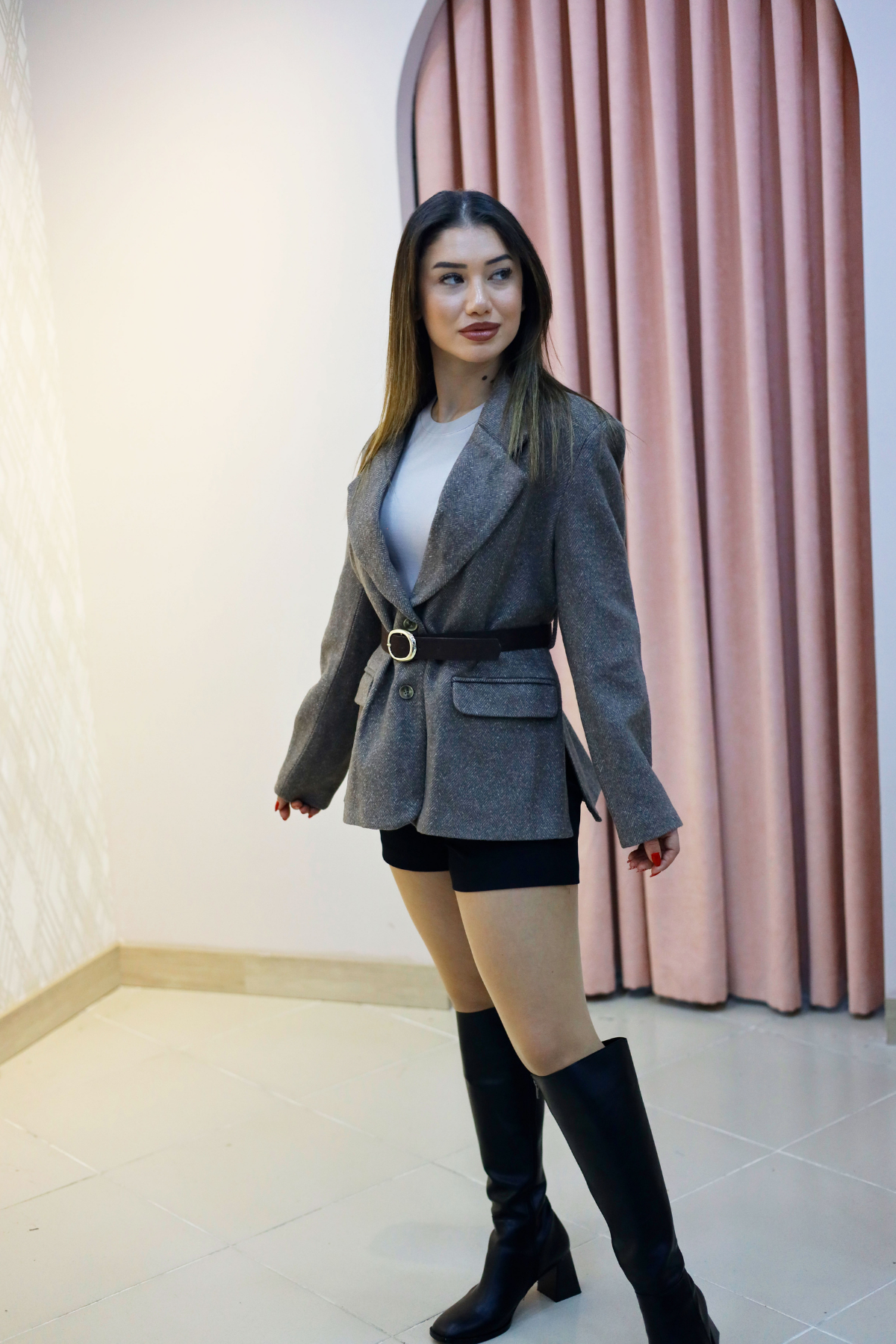 Boğazlı yaka ile modern ve şık duruş.