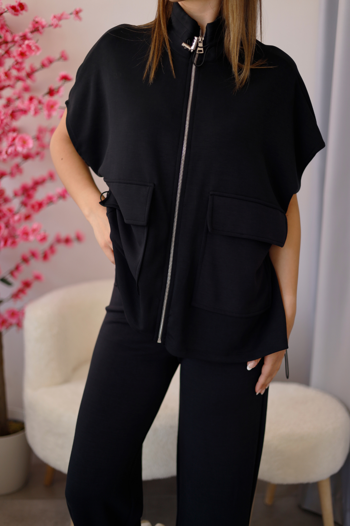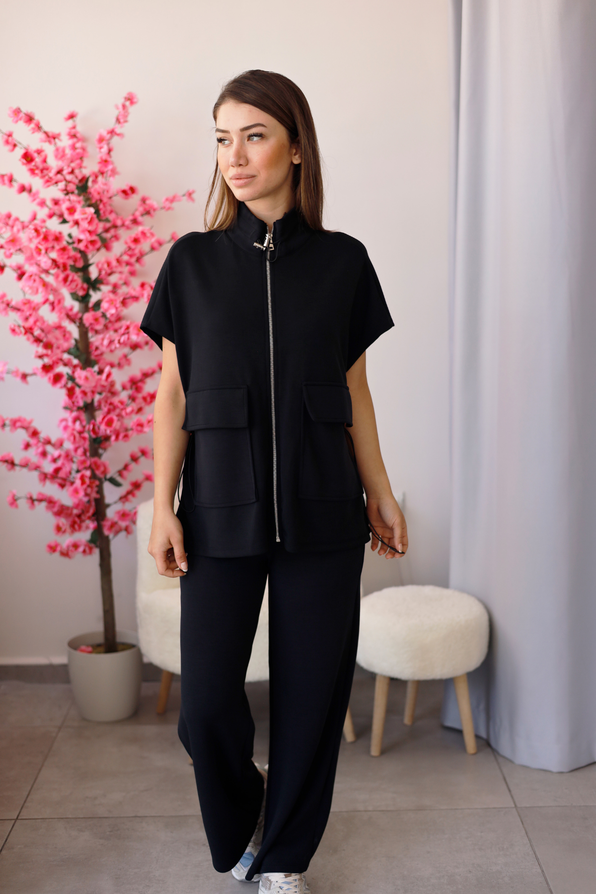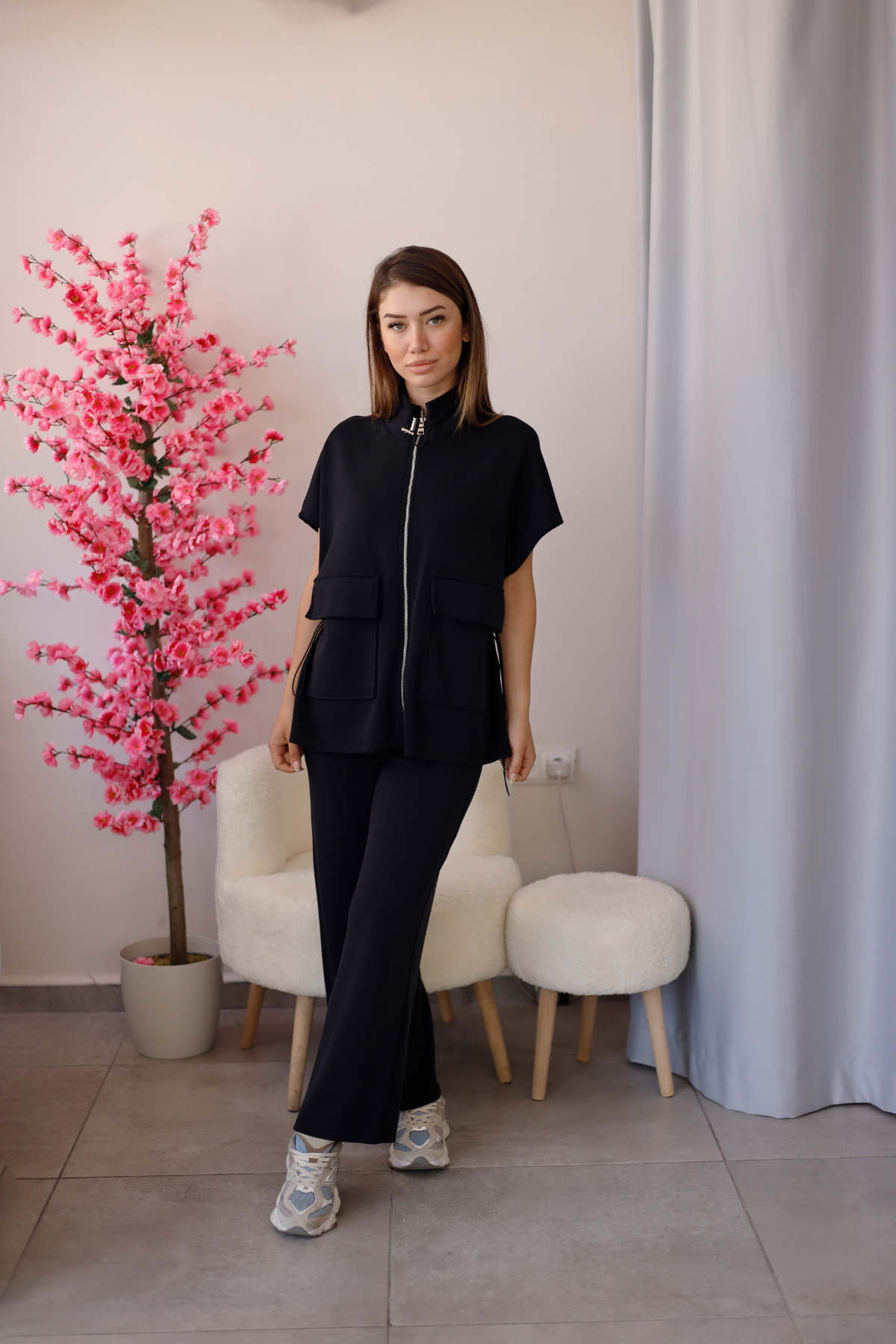 Fermuarlı üst parça, kısa kollu ve yüksek yakalı yapısıyla dikkat çeker.