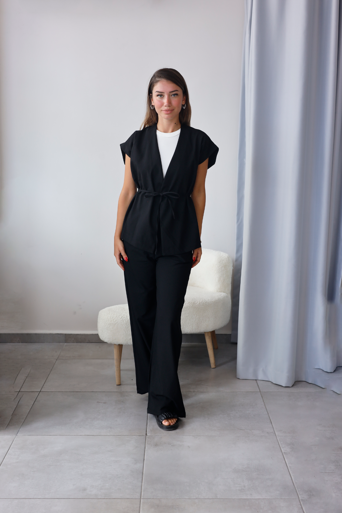 Pantolon düz bel (lastiksiz) ve tam kalıp formundadır.